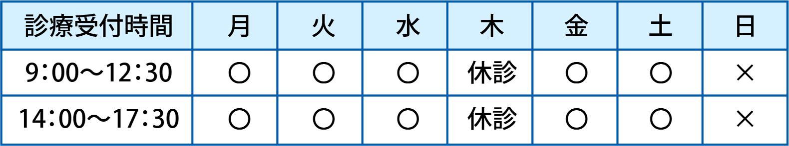 | 休診日 | 日曜・祝日、木曜日(祭日がない週のみ) |